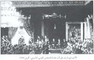 La Constituante tunisienne qui vient d'être élue le 25 mars 1956 tient sa première séance et procède à l'élection du Président de l'assemblée constituante nationale en l'occurence le Président Habib Bourguiba en présence de Lamine Bey .